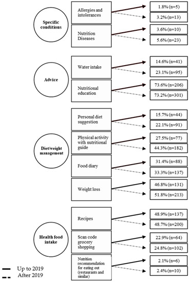Other contents, such as nutritional education, can contribute to adopting a healthier diet and, consequently, weight loss. This functionality had a decrease of 5.6% (71.8% vs. 66.2%) in the app context related to weight loss. Among the contents, nutritional education was the one with the highest percentage in both periods (73.6% vs. 73.2%), as well as being stable. This result is an important advance since education should be a permanent process and a starter for self-care and autonomy. When adequate and accurate information is provided, a specific contribution is made to structural integrity, functioning, and human development [52]. Schumer, Amadi, and Joshi [53] also found in their study that this content was the most commonly reported in a previous review of diet and nutrition apps [53].