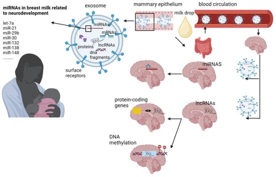 A number of recent publications have demonstrated that human milk contains components recently described as extracellular vesicles (EVs) [29]. Extracellular vesicles is a term for all phospholipid bilayer-enclosed particles that are released by cells into their environment and include exosomes and microvesicles [29]. Exosomes carry bioactive substances like proteins, DNA, messenger RNA (mRNA) and miRNAs [29,30]. Breast milk exosomes, being resistant to digestion [31], are able to transport their cargo and miRNAs to peripheral tissues via the systemic circulation and facilitate the epigenetic programming of various tissues and organs [20]. For this reason, they are considered important signaling molecules (signalosomes) between mother and child [20,32]. Since exosomes are also able to cross the blood–brain barrier, it is possible that the positive impact of breast milk on neurodevelopment is associated with miRNAs’ activity [33].