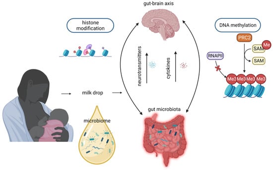 Potential mechanisms through which breast milk microbiota may exert effects on brain signaling cascades of breastfed infants. Breast milk microbiome colonizes the infant’s gut and possibly shares similar epigenetic influences on the infant’s brain. Illustration created with BioRender.com accessed on 16 August 2023.