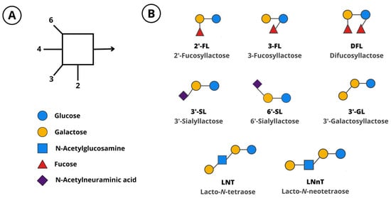 (A) Monosaccharides and linkages that compose human milk oligosaccharides. (B) Manufactured oligosaccharides. 2′-FL, 2′-fucosyllactose; 3-FL, 3-fucosyllactose; 3′-GL, 3′-galactosyllactose; 3′-SL, 3′-sialyllactose; 6′-SL, 6′-sialyllactose; DFL, difucosyllactose; LNT, lacto-N-tetraose; LNnT, lacto-N-neotetraose.