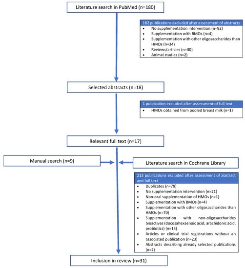 The initial literature search of PubMed identified 180 publications (Figure 2). After screening the titles and abstracts, 162 publications were excluded. We analyzed the full text of the remaining 18 publications and excluded one further study because the study product was supplemented with a pool of HMOs extracted from human breast milk [35]. The initial literature search of the Cochrane Library identified 218 publications. After screening the titles and abstracts, 213 publications were excluded. Among these, two of the excluded articles were conference contributions that summarized the results of already selected publications [36,37], and one was a clinical study describing the intranasal application of HMOs [38]. In addition to the 17 selected studies from PubMed and the five from the Cochrane Library, nine more articles that met our criteria were identified by manual searching, bringing the total number of included studies to 31.