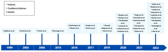 Among the 31 accepted publications, 26 described clinical trials and 5 reported follow-up studies. Twelve of the clinical studies involved healthy term infants, as well as four of the follow-up publications (Table 2). Five studies involved infants with medical conditions, of which four included infants with diagnosed or suspected allergies, and one included preterm infants (Table 3). One study involved children 1–2.5 years of age, and another included children 6–12 years of age that were overweight or obese (Table 4). Finally, eight studies involved adults (>18 years of age), of which two focused on healthy individuals, three on individuals with IBS (plus one follow-up study), and two focused on individuals diagnosed with Helicobacter pylori infection (Table 5).