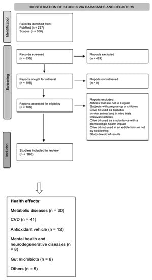 The established exclusion criteria included the following: (i) articles written in a language other than English; (ii) pregnant women or child participants; (iii) studies using OO as a placebo, rather than in the intervention; (iv) in vivo animal and in vitro studies; (v) duplicates; (vi) abstracts with irrelevant information or simply unsuitable intervention techniques; (vii) studies where OO was used as a substance with dermatologic health impact; (viii) studies not using OO in edible forms or administering OO by other forms rather than by swallowing; and (ix) studies that were devoid of any results. Only original articles were included in the study; hence, systematic reviews and meta-analyses were not included in the selection. Following the cross checking of the lists by three researchers, a total of 106 papers were identified. The final articles were separated into groups based on the claimed health effects. The distribution of the 106 articles among the different groups was as follows: 30/106 articles associated with “metabolism”, 41/106 articles with “CVD” (cardiovascular diseases), 12/106 articles with “antioxidants” capacity, 8/106 articles with “mental health and neurodegenerative diseases”, 6/106 articles with “gut microbiota”, and the final 9/106 articles were associated with “other health outcomes” (Figure 1).