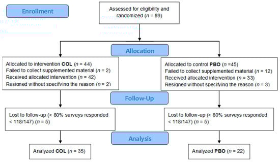 After blinding and randomization processes were completed by 29 September 2022, the parents and guardians were invited to collect the supplemented material sufficient for the entire period of the trial. The appropriate packages identifiable only by the trial ID numbers were distributed by the management of the kindergartens in which the trial was conducted. At this stage, 14 participants (2 from the COL group and 12 from the PBO group) were excluded because of not collecting the supplement despite the repeated summons. We found no rational explanation for such a disparity in the collection of supplements between the COL and the PBO group participants.