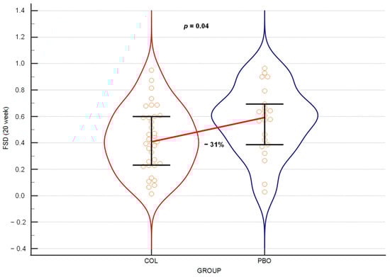 The main measure of URTIs’ occurrence used in our experiment was the frequency of days with URTI symptoms (FSD) over various periods of the trial. When analyzing all days with any severity level of URTI symptoms over a period of 21 weeks from the beginning of the trial supplementation, which was the entire period of daily survey collection, the results were found to be at the border of statistical significance (p = 0.052), with a 26% reduction in URTI frequency in the COL group compared to the PBO group. When the same parameter was tested after 20 weeks of the trial, it produced a statistically significant result (Figure 2).
