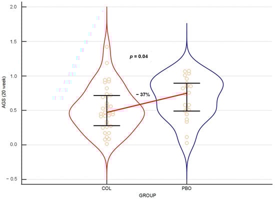 Our second primary outcome was the AGS of URTI symptoms. The statistically significant reduction in AGS medians was observed in the COL vs. the PBO group when the period from beginning of supplementation until week 20 was assessed. The repeated measures of periods ending at weeks 4, 8, 12, 14, 16 and 18 also consistently showed a significant result in this regard, while the borderline significance was found at week 21 (p = 0.052).