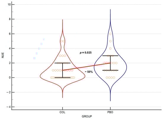 Due to the difficulty in defining URTI events, especially based on the self-reported URTI symptom days, we decided to use the number of URTI episodes (NUE) over the entire duration of the trial as a secondary outcome. At week 21 of the trial, there was a statistically important difference between the result obtained in the COL group versus the PBO group (p = 0.025), with a 50% reduction in these events’ median in the COL group (Figure 4).