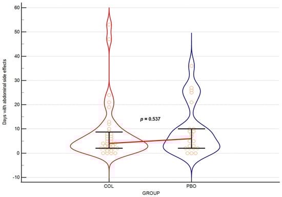 Over the entire course of the trial (21 weeks), we observed no serious side effects that would lead to a discontinuation of supplementation. The reports on the symptoms (bloating, abdominal pain and diarrhea) involving the gastrointestinal tract showed no difference between the COL and the PBO groups (p = 0.537) (Figure 5).