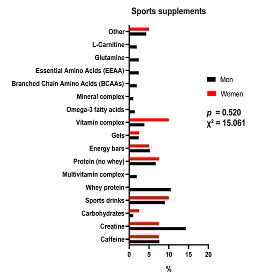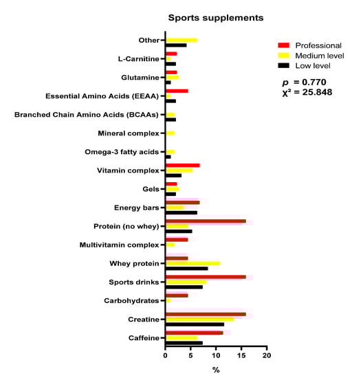 Regarding the timing of the ingestion of supplements, this has been shown to play an important role in optimising performance and physical recovery [55]. In the present study, no differences were found regarding when sports supplements were consumed. However, a previous study focussing on fencers did not find differences between levels of competence. Men preferred the intake of sports supplements during sports practice, whereas women supplemented them throughout the day (before, during and after practice, independently) [49].