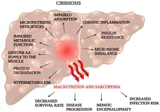 Cirrhosis is characterized by severe fibrosis of the liver due to various factors, such as viral infection, drugs, and alcohol, as well as the end stage of chronic liver disease [,]. As a result of liver cirrhosis, absorption, and its functions, for example, metabolic, are impaired, such as the transformation of proteins, fat, carbohydrates, or toxic compounds, and as a result, cirrhosis becomes a systemic disease [,]. In addition, hypermetabolism is observed in 15–30% of patients with cirrhosis, and their resting energy expenditure is >120%, which adversely affects nutritional status [,,]. During the progression to cirrhosis, the risk of malnutrition and sarcopenia increases—Figure 2 [,].