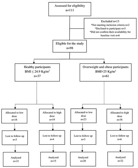 A total of 111 volunteers were initially screened; among them, 98 individuals met the eligibility criteria for the study—37 healthy subjects and 61 overweight/obese participants. The healthy subjects were randomly assigned to either the low-dose group (n = 18) or the high-dose group (n = 19). Similarly, the overweight and obese participants were also assigned to either the low-dose group (n = 23) or the high-dose group (n = 38). Study participants were asked to keep their same daily routine during the trial period.