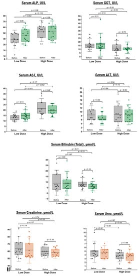 Concerning hepatobiliary indices, including serum AST, BT, BD, sAlb, ALT, ALP, and GGT, no differences were observed post-intervention compared to the baseline measurements. However, there was a significant reduction in ALT levels in the low-dose group of healthy participants, which remained within the normal range (Figure 2).