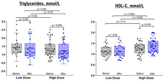Data are presented as mean ± standard deviation (SD). Normal distributions of the data were assessed by the Shapiro–Wilk test. The homogeneity of variance was measured using Levene’s test. Within-group differences in the parameters before and after the intervention were compared using a paired t-test (for normally distributed data) and Wilcoxon signed rank test (nonparametric data). Between-group differences (low dose vs. high dose) in the parameters were assessed by using an independent samples t-test (parametric and equal variances), Welch’s t-test (unequal variances), and Mann–Whitney U test (nonparametric). Results were considered significant at p < 0.05. All statistical analyses were performed using SPSS 28.0 for Windows (IBM Corp., New York, NY, USA).