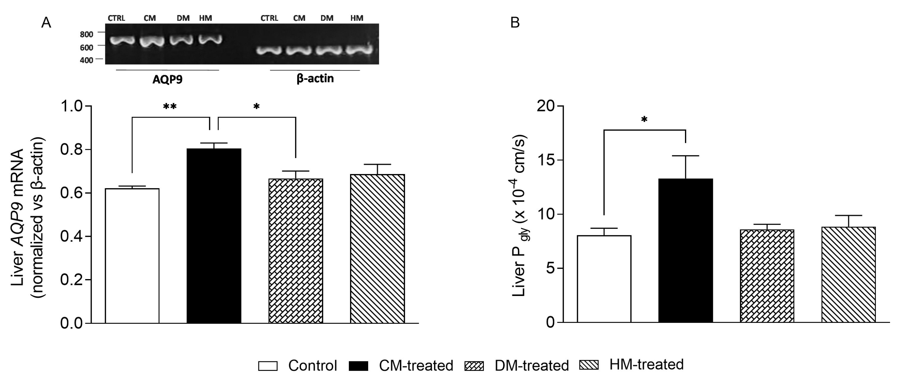 3.5. Liver AQP9 and Glycerol Permeability Are Increased in Rats Supplemented with Cow Milk