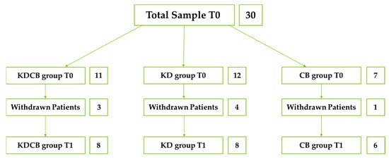 Then, the sample was divided into three groups: 11 patients treated with the ketogenic diet and carboxytherapy (KDCB group), 12 with the ketogenic diet only (KD group), and 7 with carboxytherapy only (CB group).
