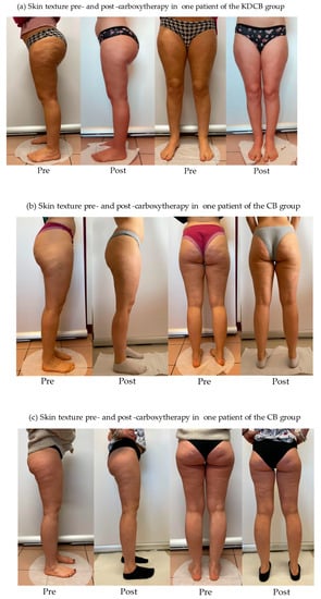 In the KDCB and CB groups, an improvement in skin texture in the legs was observed, as shown in the pictures (Figure 2a–c).