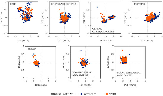 Despite all these statistically significant differences, only a few of them may be considered nutritionally relevant (see Material and Methods). The main difference was the increased fibre content in all food types, already described above. Biscuits and toasted bread and similar bearing fibre-related NCs had lower values for saturated fat, while total fat content was higher in bread and plant-based meat analogues. No other nutritionally relevant difference was observed.