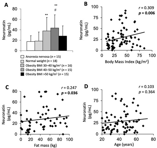 In Sample 1 (n = 79), obese subjects in group BMI 40–50 displayed significantly elevated plasma Nnat levels compared to subjects in AN and normal weight group, and obese subjects in group 30–40 kg/m2 had higher plasma Nnat levels than subjects in normal weight group (A). Over the whole sample, plasma Nnat is positively correlated with body mass index in kg/m2 (B) and fat mass in kg (C) but not with age in years (D). Data are expressed as mean, standard deviation. Values for r and p are indicated in each correlation graph. ** p < 0.01 vs. Anorexia nervosa group, # p < 0.05 vs. Normal weight group.