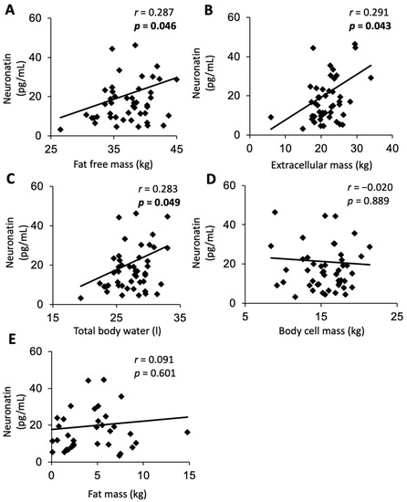 In Sample 2, the mean plasma Nnat concentration was 20.8 ± 20.6 pg/mL (range: 3.3–109.7 pg/mL). Nnat did not show an association with BMI, age, and all measured activity parameters (p > 0.05). However, we observed weak positive correlations between peripheral Nnat levels and fat-free mass (r = 0.287, p = 0.046; Figure 2A), extracellular mass (r = 0.291, p = 0.043; Figure 2B), and total body water (r = 0.283, p = 0.049; Figure 2C). No correlation was found with other body composition parameters such as fat mass (r = −0.091, p = 0.601; Figure 2D) and body cell mass (r = 0.020, p = 0.889; Figure 2E).