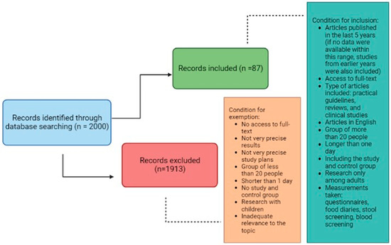 A systematic literature search was conducted using the PubMed database to identify studies relevant to the current review. The following search string was used: (“irritable bowel syndrome” OR “IBS” OR “microbiome” OR “intestinal diseases” OR “colorectal cancer”) AND (“treatment” OR “diet” OR “low FODMAP diet” OR “FODMAP” OR “fiber” OR “vegetables” OR “fruits” OR “legumes” OR “grain products” OR “gluten-free diet” OR “gluten” OR “dairy products” OR “fermented dairy products” OR “lactose-free diet” OR “lactose” OR “fish” OR “omega-3 fatty acids” OR “eggs” OR “meat” OR “protein” OR “processed meat” OR “processed food” OR “supplementation” OR “probiotics” OR “psyllium” OR “vitamin D”). We attempted to limit the search to articles published within the last 5 years; however, if no data were available within this range, studies from earlier years were also included. Among the 2000 literature items found, 87 practical guidelines, reviews, and clinical studies were selected for article preparation. We only included studies in English to which we had full access. The inclusion criteria also included studies involving groups of more than 20 people, lasting longer than one day, including study and control groups, and conducted only with adults. Included studies used questionnaires, food diaries, and stool or blood screening. Exclusion criteria included lack of access to full texts, imprecise results and study designs, studies involving groups of less than 20 subjects, shorter than one day, not including a study and control group and involving children, or inadequate relevance to the topic. The conditions for inclusion and exclusion of articles are shown in Figure 1.
