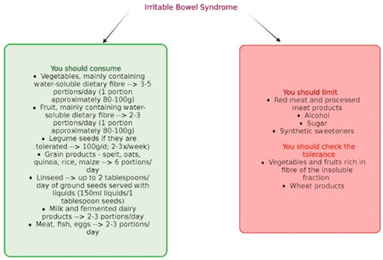 Individuals with IBS should primarily consume vegetables and fruits low in insoluble dietary fiber and rich in soluble fiber fractions. When it comes to vegetables, they can choose carrots, tomatoes, zucchini, eggplant, cucumbers, bell peppers, broccoli, asparagus beans, spinach, pumpkin, or lettuce. Well-tolerated fruits include berries, raspberries, strawberries, honeydew melon, cantaloupe, grapes, oranges, and lemons. However, it is important to note that individuals with IBS should not completely eliminate vegetables and fruits that are contraindicated. Instead, they should individually assess their tolerance to specific types of vegetables and fruits. It is also important to consider not only the type of product but also the quantity and preparation methods. It is worth noting that the highest amount of fructans is found in the skin of vegetables and fruits, so patients may tolerate these products well after peeling them [44,45]. Individuals with IBS should aim to consume 3–5 servings of vegetables per day and 2–3 servings of fruits per day [13].