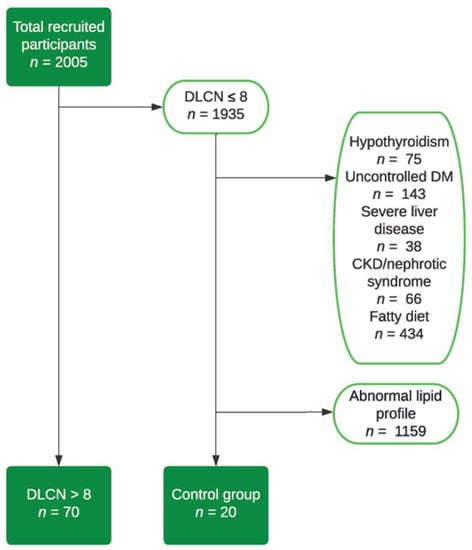 The inclusion criteria were a DLCN score of more than 8 points, an age over 18 years old, and a signing of the informed consent. The exclusion criteria were a DLCN score of less than 8 points and the diagnosis of at least one of the following conditions: hypothyroidism, chronic kidney disease with a low creatinine clearance, nephrotic syndrome, diabetes mellitus with uncontrolled glycemic values, severe liver disease, or a hypercaloric diet (total fat intake more than 40% of the daily caloric intake) [8], in order to diminish the possibility of secondary hypercholesterolemia (Figure 1).