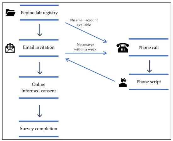 Due to the constraints imposed by the COVID-19 pandemic, in-person research was unfeasible, and therefore a self-administered web-based survey was designed for participants to complete from their homes. We emailed potential participants an online informed consent and a link to complete the web-based survey. We attempted to contact participants up to three times, including a phone call whenever the email address was unavailable (Figure 1). Data was collected using Qualtrics XM software (Qualtrics, Provo, UT, USA), and participants had the option to receive a USD 20 (Amazon gift card) as compensation for their time. The survey could be completed in 40–50 min, saved for continuing to answer later, and included the following questionnaires: