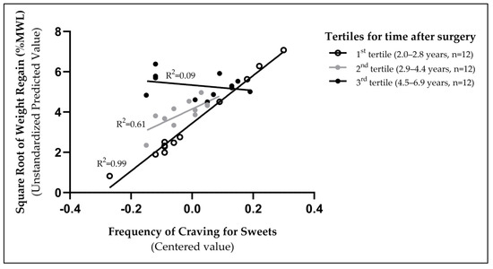 To interpret the interaction between the frequency of cravings for sweets and the time elapsed since surgery as they related to weight regain, we grouped women based on their time after surgery using tertiles (Figure 2). As illustrated, the association between the frequency of sweet cravings and weight regain was strongest in the group closer to the surgery (1st tertile = 2.0–2.8 years; R2 = 0.99) and then weakened as time passed from surgery (2nd tertile = 2.9–4.4 years; R2 = 0.61, and 3rd tertile = 4.5–6.9 years; R2 = 0.09). The three groups of women categorized based on time elapsed since surgery were of similar age (p > 0.98) and BMI (p > 0.25).