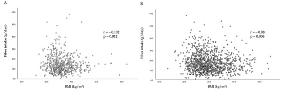Correlation between dietary fibre intake and body mass index (BMI) in men (A) and women (B). Spearman test; statistical significance p < 0.05.