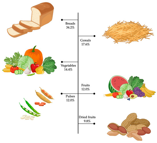 No unique consensus has been reached on the recommendation for dietary fibre intake. Based on the available scientific evidence, the European Food Safety Authority (EFSA), the Food and Agriculture Organization of the United Nations (FAO), and the World Health Organization (WHO) set out a recommended intake of 25 g per day for adults and indicated that this recommendation could be achieved through the consumption of food sources such as fruits, fresh vegetables, potatoes, whole grains, pulses, nuts, and seeds [27]. Despite the information aforementioned, DF intake does not exceed 20 g per day at the global level. In this context, in 2015, the Scientific Advisory Committee on Nutrition in the United Kingdom recommended increasing this intake to 30 g per day; however, only 9% of adults in the United Kingdom reached this goal [28].