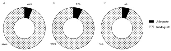Compliance rate with the recommended minimum intake of dietary fibre according to the European Food Safety Authority (EFSA), Food and Agriculture Organization of the United Nations (FAO), and World Health Organization (WHO). Data are presented as a percentage (%) for (A) Total population; (B) Men; (C) Women.