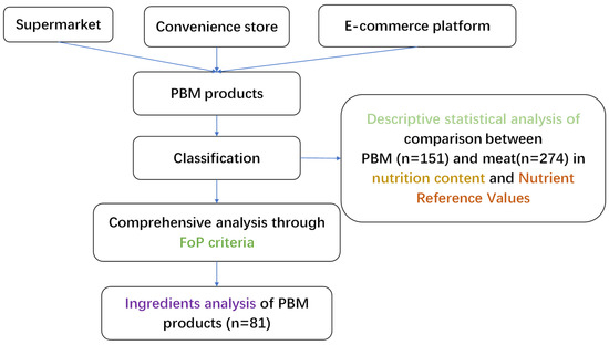 PBMs stimulate the taste and types of meat products. Different ingredients are added to achieve an “analogue” effect, which may cause variation in nutrients. To have a more comprehensive and specific understanding of nutritional quality of PBM products, we processed PBM and corresponding meat data in two classification ways. Classification Ⅰ divides PBM data into 4 categories from what kind of animal meat analogue they are (plant-based pork, plant-based beef, plant-based seafood, and plant-based poultry). Classification Ⅱ divides PBM data into 7 categories according to different processed product types (burger, sausage, mince, jerky, meatball, plain meat analogue, and breaded meat analogue). Meat products are categorized in correspondence to the two classifications of PBM. Table 1 (a), (b) show the categories and corresponding description. The framework (Figure 1) shows the inclusion of PBM and meat products in the classification and analysis process.