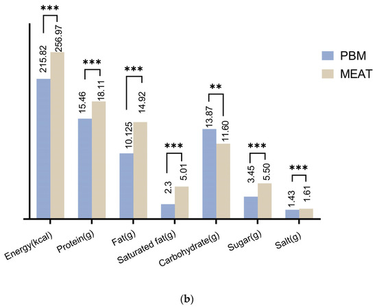Figure 3a,b depicted the disparity in content by considering meat as the reference baseline and calculated the discrepancies as the percentage of corresponding plant-based meat. The specific means (sd) of each category, along with corresponding p-value obtained from two independent sample t-test, are presented in Appendix A.