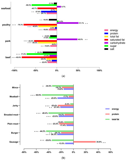 Furthermore, specific analysis was conducted with descriptive statistics (mean, SD, range) for total fat, saturated fat, protein, carbohydrate, sugar, and salt (g/100 g) and for energy density (kcal/100 g) for all PBMs and their corresponding meat categories, and p-value derived from two-sample t-testing for the assessment of significant difference of each class. For visual presentation, a horizontal bar chart was displayed with mean nutrient content of meat products as the baseline, showing percentage difference of corresponding PBM products.