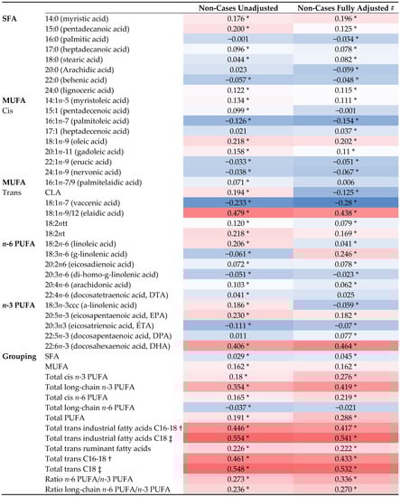 | 22:6n-3 (docosahexaenoic acid, DHA) | 0.406 | <0.001 | 0.464 | <0.001 | 0.413 | <0.001 |