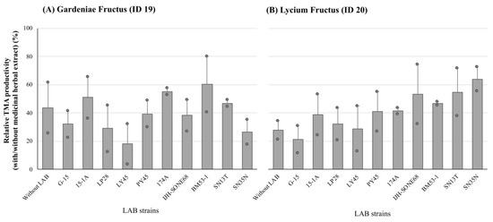 The relative latent TMA productivities of the cecum samples collected from ethanol-fed mice in the presence of lactic acid bacteria (LAB)-fermented Gardeniae Fructus (A) and Lycium Fructus (B) extracts. The values are indicated as the mean ± S.E. (n = 2).