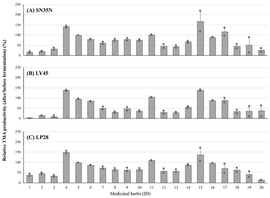 The changes in TMA productivities of the cecum samples collected from ethanol-fed mice in the presence of medicinal herbal extracts fermented with L. plantarum SN35N (A), P. pentosaceus LY45 (B), and P. pentosaceus LP28 (C). IDs of the medicinal herbs are summarized in Section 2. The values are indicated as the mean ± S.E. (n =2).