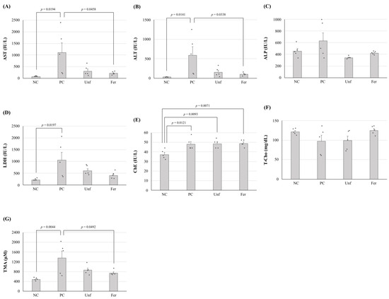 Differences in the serum aspartate aminotransferase (AST) (A), alanine aminotransferase (ALT) (B), alkaline phosphatase (ALP) (C), lactate dehydrogenase (LDH) (D), cholinesterase (ChE) (E), total cholesterol (T-Cho) (F) levels, and latent TMA productivities of the cecum samples (G) between each experimental group. Samples were collected from mice without ethanol feeding (NC), ethanol-fed mice (PC), and ethanol and unfermented (Unf) or fermented (Fer) stevia extract-fed mice. The values are indicated as the mean ± S.E. (n = 5). Statistical analyses were performed using the Tukey–Kramer multiple comparison test.
