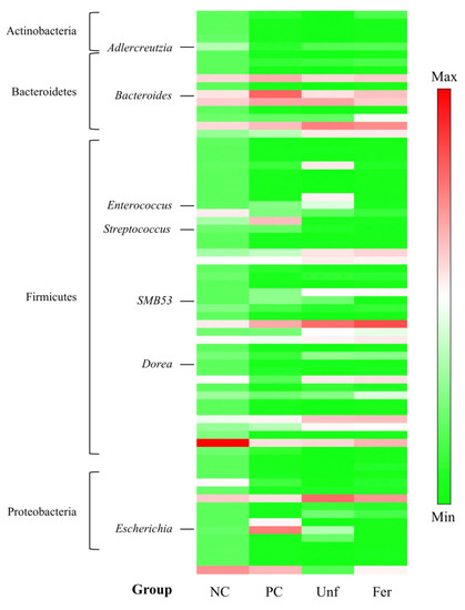 The cecal microbiota in each group were determined using the V3–V4 region in 16S rDNA and indicated by the standardized relative abundance ratio. Denser green and red indicate lower and higher amounts, respectively. The experimental content of each group is the same as that in Figure 5.