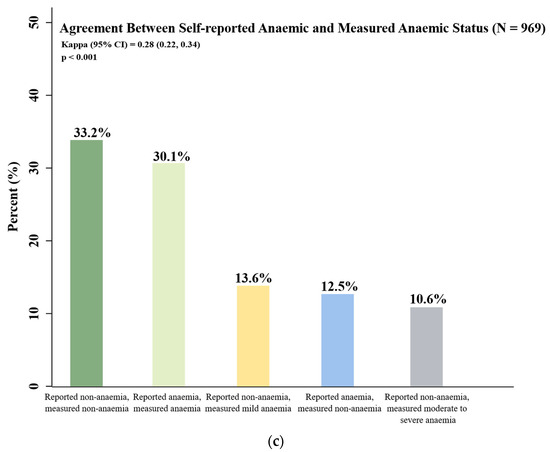 Figure 1a shows the overall prevalence of measured anaemia in the participants to be 54.3%, with 28.6% of participants found to be mildly anaemic and 25.7% of participants found to be moderately to severely anaemic. When asked to self-report their anaemia status prior to the finger-prick test, 42.6% of participants had reported being anaemic (Figure 1b). Importantly, as shown by the results in Figure 1c, there was indeed an absence of agreement between self-reported and measured anaemia status (κ = 0.28, 95% CI [0.22–0.34], p < 0.001). Although 57.4% of all participants had self-reported that they were not anaemic, 24.2% of these participants were then measured to be anaemic. Of the 24.2% measured to be anaemic, 10.6% were found to be moderately to severely anaemic and 13.6% mildly anaemic.