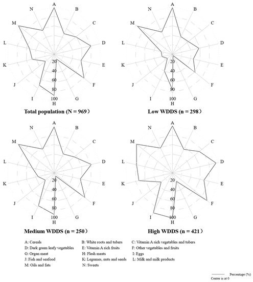 | Consumption by Food Group (Not Consumed = No, Consumed = Yes) | Low-WDDS Group (%) (n = 298) | Medium-WDDS Group (%) (n = 250) | High-WDDS Group (%) (n = 421) | p Value |