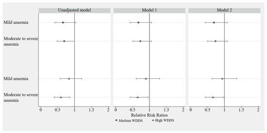 Associations between WDDS group and anaemia status among pregnant women in rural Sichuan Province in China (N = 969). Notes: Model 1 is adjusted for survey year, maternal age, occupation, education, SES, family size, gestational age, and parity. Model 2 is further adjusted for iron supplement intake and folic acid supplement intake during pregnancy.