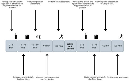 This was a randomized, placebo-controlled, double-blind, crossover trial consisting of two phases: introductory testing and the first performance assessment (Cooper test) and the second performance assessment. Subjects were randomly assigned into one of two groups (A and B) using simple randomization with Excel by an outside party within the research institution; the details of the randomization series were unknown to any of the investigators or the coordinator. The details of the randomization were kept in a secure place (personal laptop secured with a personal code) by the researcher. Based on the randomization, the researcher labeled the provided supplements and placebo drinks accordingly to be used in the intervention trial. After all relevant data were gathered and the trials were finished, we gained access to data as to which football players received nitrate supplementation in the first trial and placebo in the second trial prior to the performance assessment, and which football players received placebo supplementation in the first trial and nitrate supplementation in the second trial prior to the performance assessment. Details around the performance assessment and supplementation strategies are explained in Section 2.2 (Performance Assessment). A schematic overview of the research process is presented in Figure 1. Ethical approval was given by the Medical Ethics Commission of the Republic of Slovenia (protocol code 0120-601/2021/15).
