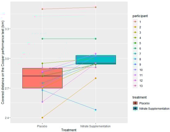 Hypothesis 1 proposed that nitrate supplementation would have a significant positive effect on covered distance in the Cooper performance test compared to placebo if the baseline dietary nitrate intake was low (<300 mg nitrates) in both the placebo and intervention groups. In 13 participants, the baseline nitrate intake was below 300 mg in both the placebo and the intervention groups, with two players exceeding these baseline values and being omitted from Hypothesis 1. The football players in the intervention group had an average covered distance in the Cooper performance test of 2.98 km, with a standard deviation of 0.28 km, minimum of 2.48 km, and a maximum of 3.52 km. The average distance covered by the placebo group was 2.84 km, with a standard deviation of 0.23 km, minimum of 2.4 km, and a maximum of 3.5 km (Figure 2). Hypothesis 1 was accepted using a paired-samples t-test. We found a statistically significant difference in covered distance in the Cooper test between the placebo and intervention groups (t = −3.0336, df = 12, p-value = 0.0104). A sample estimate of the mean differences between pairs is −0.1446154 km with a corresponding 95% confidence interval [−0.25 −0.04].