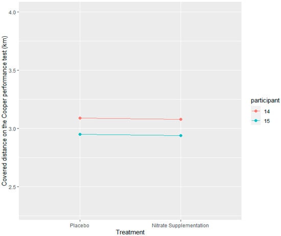 Hypothesis 2 proposed that nitrate supplementation would not have a significant positive effect on covered distance in the Cooper performance test compared to the placebo if the baseline dietary nitrate intake was high (>300 mg nitrates) in the placebo group. Only two participants were eligible for this hypothesis testing, labeled as participant numbers 14 and 15 (Figure 3). The football players in the intervention group had an average covered distance in the Cooper performance test of 3.01 km, with a minimum of 2.94 km and a maximum of 3.08 km. The average distance covered by the placebo group was 3.02 km, with a minimum of 2.95 km and a maximum of 3.09 km (Figure 3). Based on the low number of eligible participants, the statistical test for this hypothesis was omitted as no definitive conclusions could be drawn.