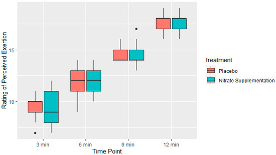 Hypothesis 3 proposed that perceived exertion during each quarter of the trial, as well as average perceived exertion, would be significantly lower in the intervention group compared to placebo if the baseline dietary nitrate intake was low (<300 mg nitrates) in the placebo group. Hypothesis 3 was rejected using a paired-samples t-test. There was no statistically significant difference in average perceived exertion in the Cooper test between the placebo and intervention groups in the first quarter (t = −0.39477, df = 12, p-value = 0.6999), second quarter (t = −0.74278, df = 12, p-value = 0.4719), third quarter (t = 0.2907, df = 12, p-value = 0.7762), or fourth quarter of the Cooper test (t = 0.56195, df = 12, p-value = 0.5845) (Figure 4). As perceived exertion did not statistically differ at any time point between the placebo and intervention trial, analyzing the difference between mean average perceived exhaustion throughout the trial was deemed unnecessary.