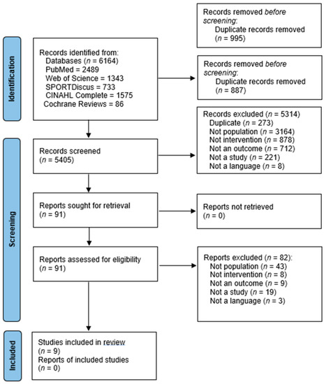 Figure 1 illustrates the PRISMA flow diagram. The initial search identified 6164 articles using database searches. Following the title and abstract screening, 91 entire papers were retrieved and assessed for inclusion, with 9 being eligible for inclusion [34,35,36,37,38,40,48]. Walton et al. [41] was excluded in the final review stage because it was unclear whether the participants (ex-National Football League players with a history of SRC) had chronic symptomology. Another paper [49] was excluded because it was unclear if participants had chronic symptoms. The participants had to make contact within 10 days of initial injury, and the intervention lasted 3 months. The majority of included studies were conducted after 2011 [34,35,37,38,40,41,48]. Of the nine studies, five were randomised-controlled trials (RCTs) [36,37,38,48]. Five papers had level II evidence [36,37,38,39,41,48,49] and three papers had level III evidence [34,35,40].