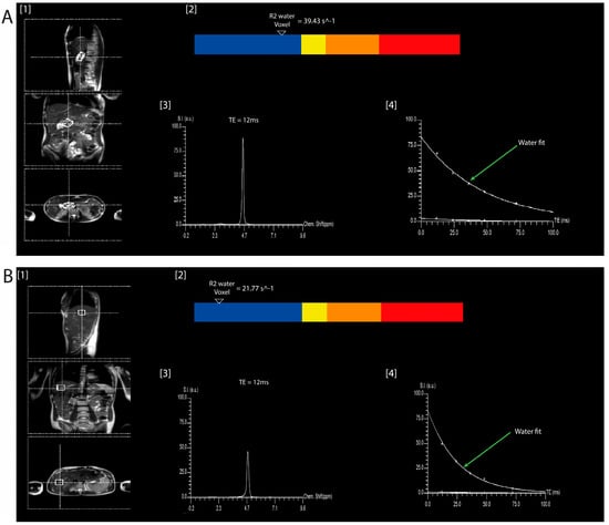Determination of R2water values with the use of T2-corrected multi-echo single-voxel (HISTO) sequence. Footnotes: The pancreas (A) and liver (B) R2water measurements involved three principal steps. First, voxels were placed over the pancreas and liver (1). Second, results were displayed in colour bars, ranging from blue for the lowest value to red for the highest value of R2water in the single voxel for the whole tissue volume (2). Third, the water spectra for TE = 12 ms (3) and graphs of T2 decay of water (4) were used to estimate the equilibrium signals.