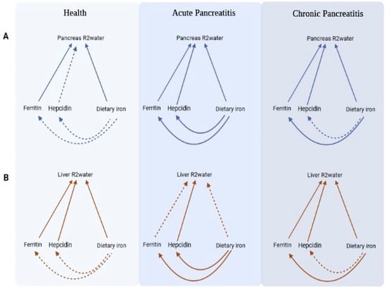 Summary of key findings in regard to pancreas R2water (A) and liver R2water (B). Footnotes: Solid arrows represent statistically significant (p < 0.05) associations, whereas dashed lines represent non-significant associations (after adjustment for age, sex, body mass index, and glycated haemoglobin). Dietary iron means total iron intake in this figure. All associations were from generalised additive model.
