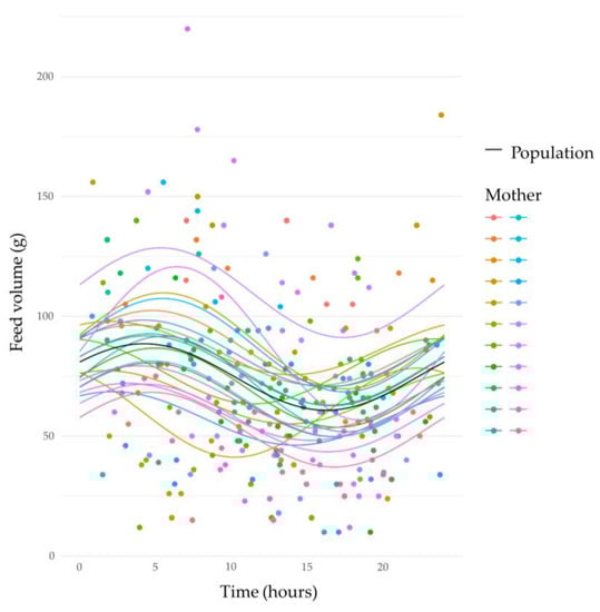 Changes in human milk feed volume (g) over a 24 h period. Coloured dots represent individual mother’s data with the corresponding coloured best-fit line; solid black line indicates the population average.